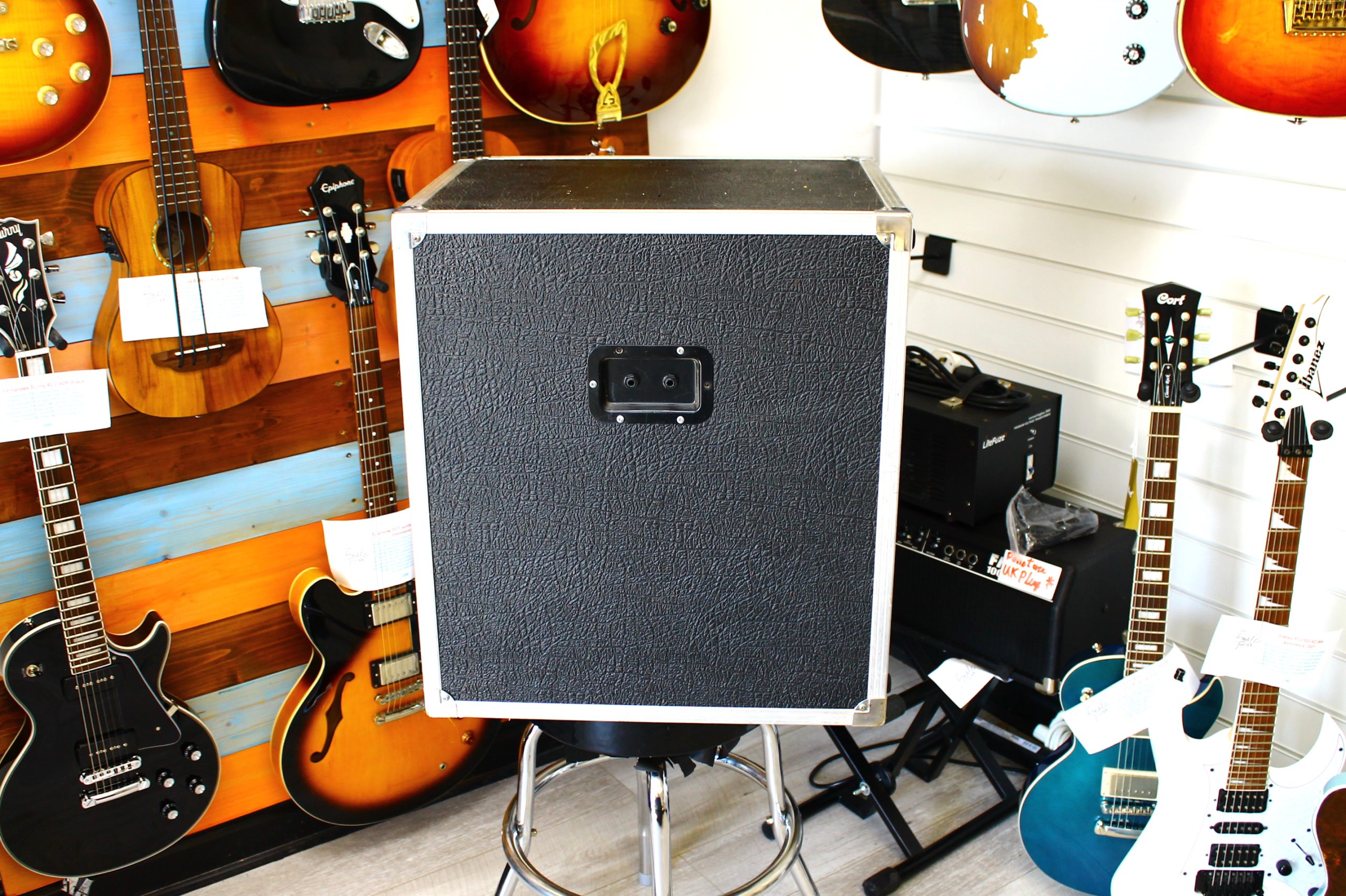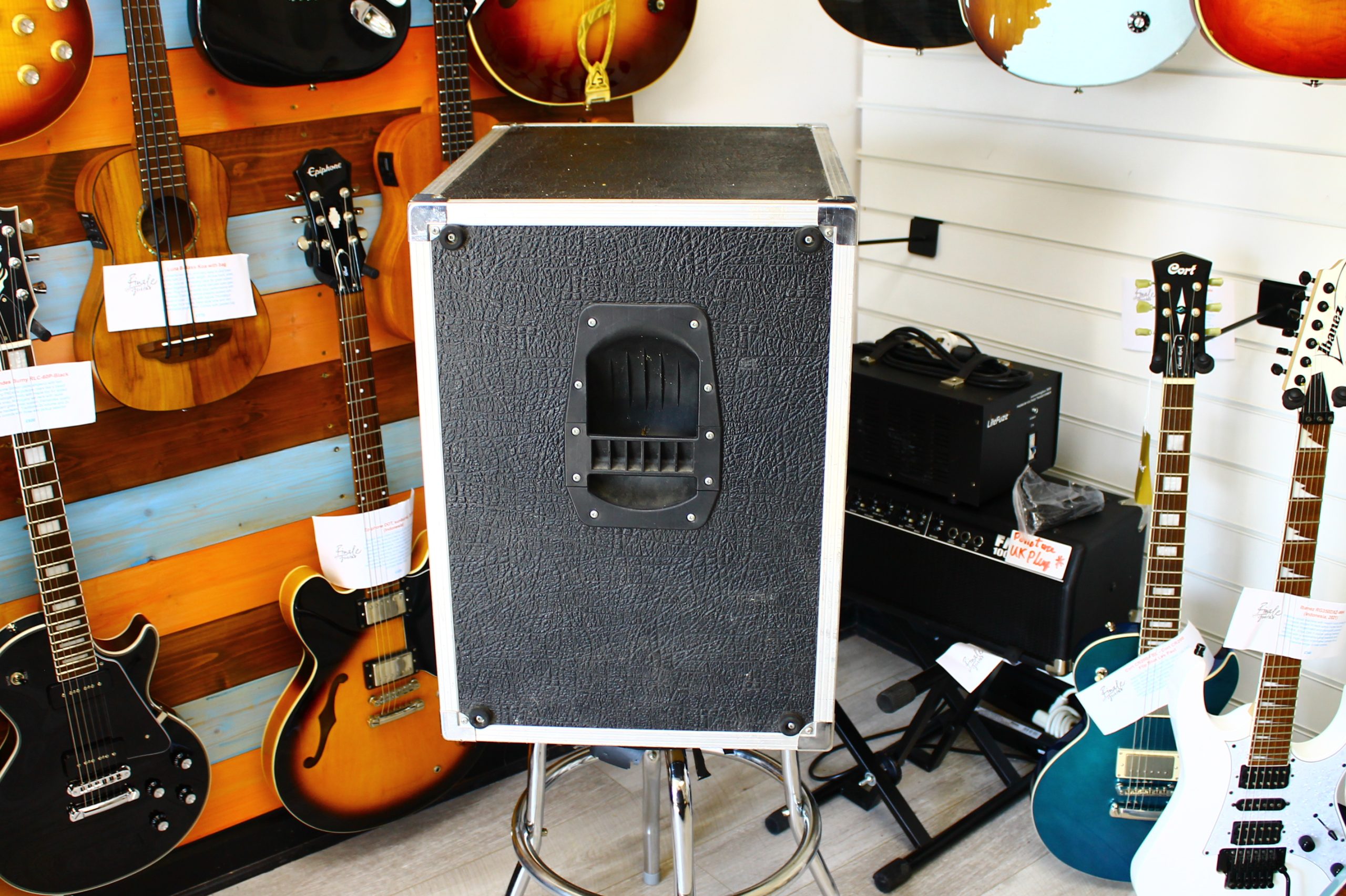 This powerful bass guitar speaker cab was hand built in Sheffield and has dual ports and a practical side carry handle as well as sturdy rubber feet. It’s loaded with a 15″ Eminence Delta speaker which really packs a whallop! It’s also pretty sensible weight wise, coming in at under 25kg. All corners and edges are reinforced with metal strips and corner protectors and there’s also a sturdy metal front grille, meaning you won’t have to worry about damage while on the road. All in all this is a great sounding gig bass cabinet so call in for a test drive between 10-5 Tuesday to Saturday, or check out now to arrange affordable postage anywhere in the UK.