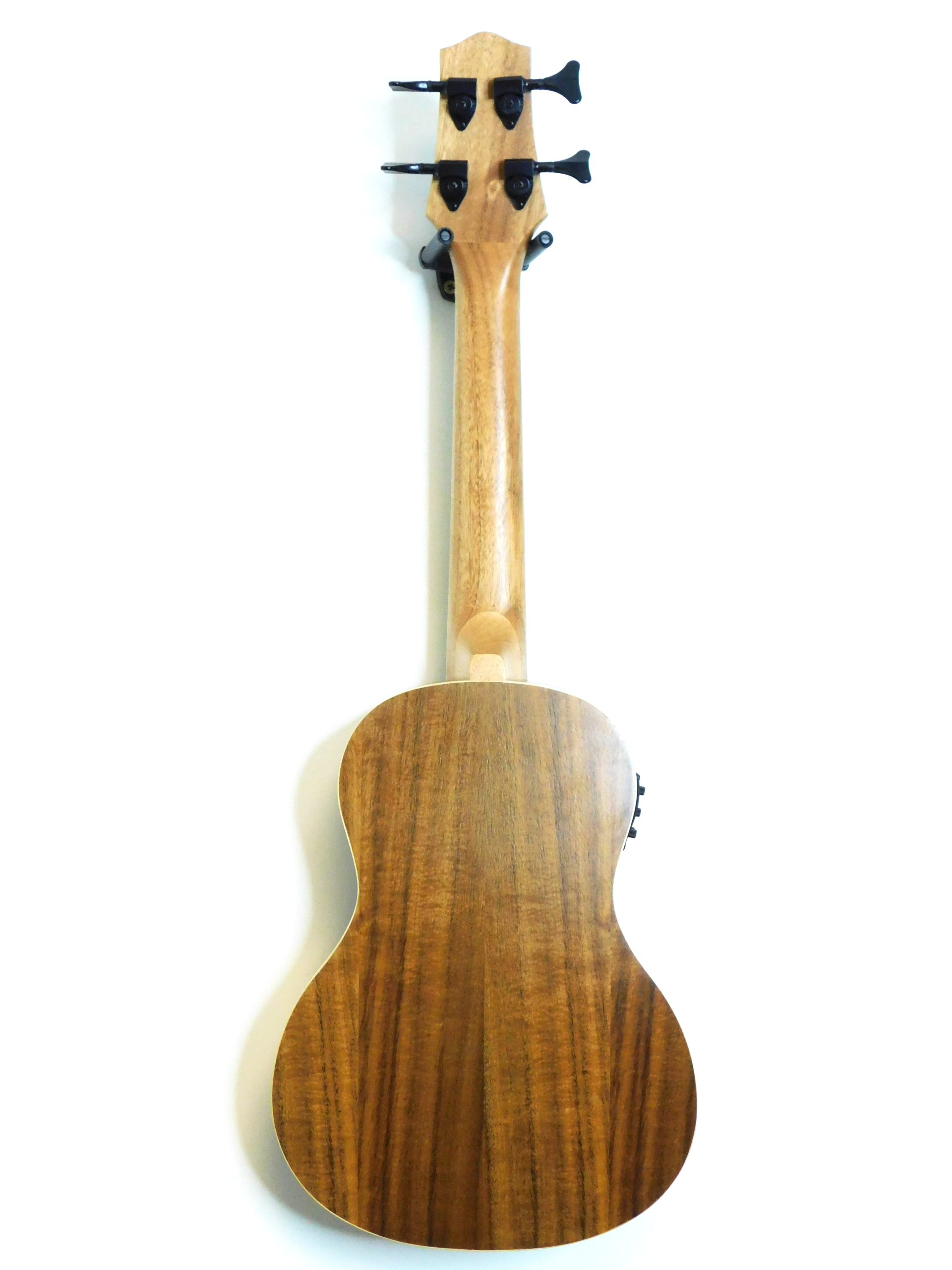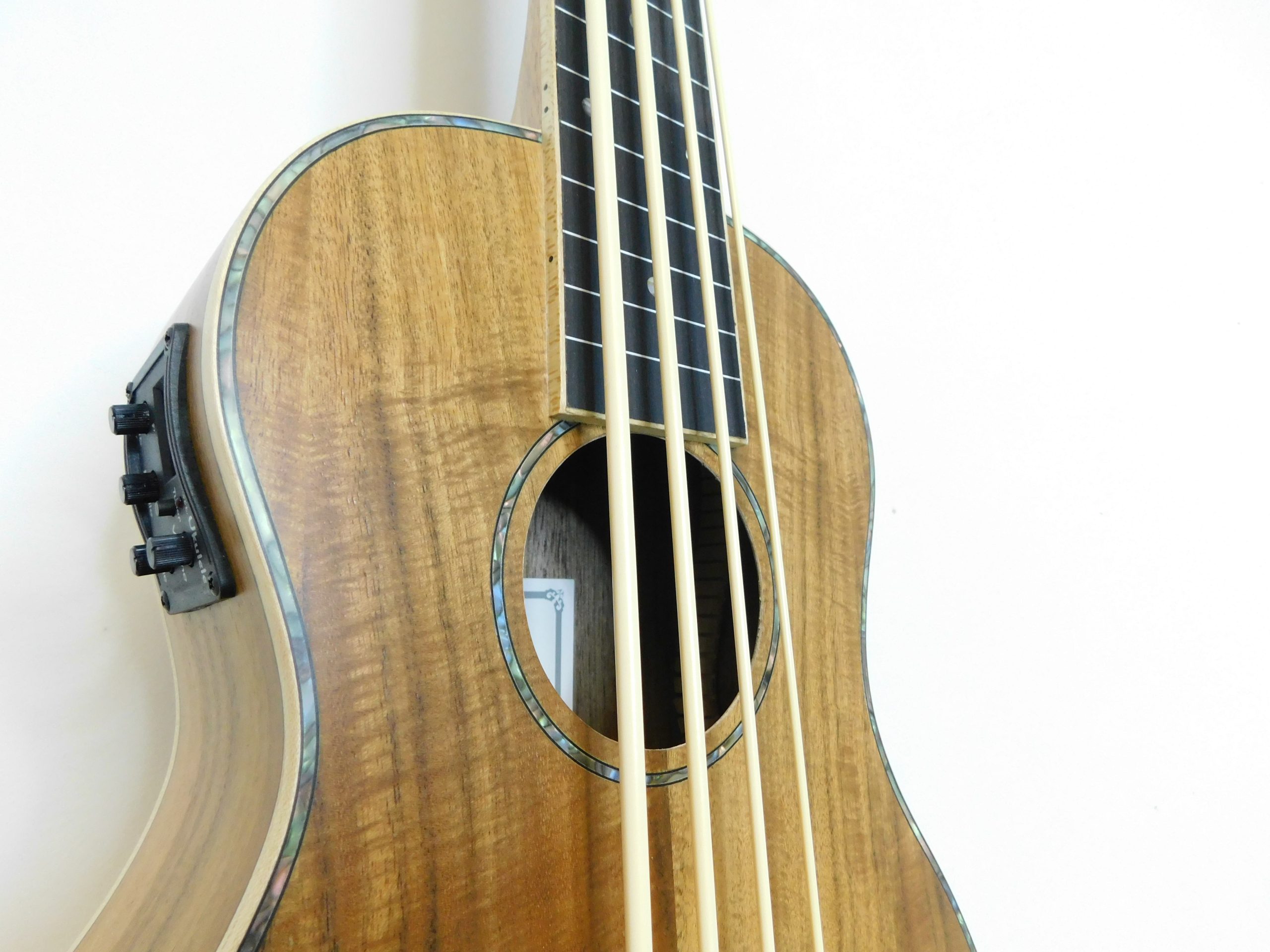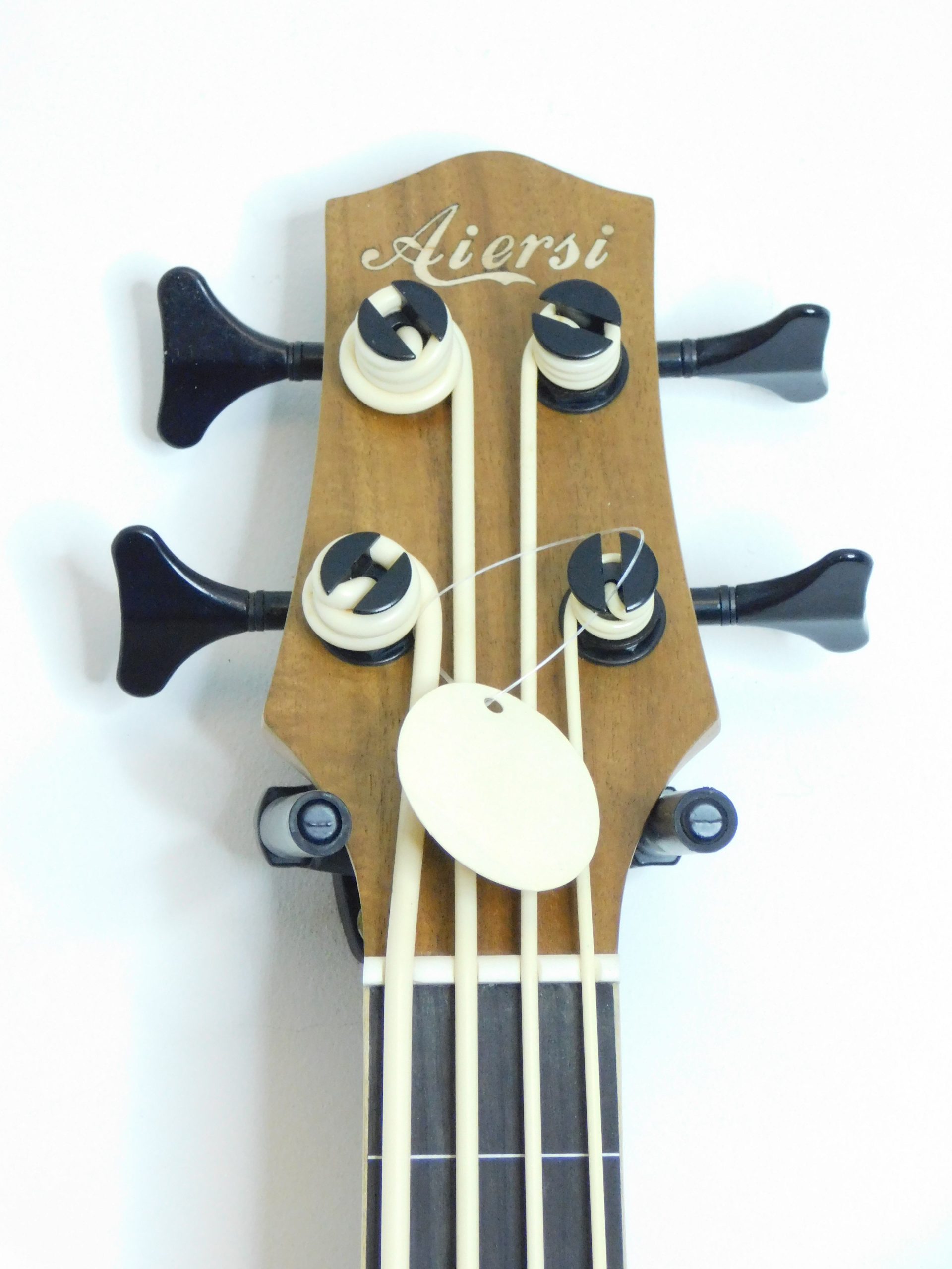 These beautiful koa ukulele basses from Aiersi offer classic double bass style tone either acoustically or amplified, in a small and very playable package! Their koa bodies have a gorgeous golden grain which is brought out nicely by the smooth satin finish and offset with attractive maple binding and faux abalone binding. The mahogany neck has a very comfortable slim D profile and the Aquila thundergut strings are very easy to hold down. The playing action is comfortably low and the clear, white markers make it very intuitive to find the correct points on the fretboard for accurate intonation. The hardware is quality too, with precise and reliable black geared tuners and a superb sounding under-saddle pickup and side mounted preamp. The preamp offers a wide range of tonal options with simple volume and three band EQ controls. There’s also a built-in tuner which is very precise and even works on the lowest notes this instrument can produce (the E equivalent to the bottom string of a standard bass guitar), meaning that you’ll never have to worry about tuning up in loud environments. All in all these fun and intuitive ukulele basses are a great way to fill out the sound at your local jam session or just enjoy smooth bass tone in the comfort of your living room!