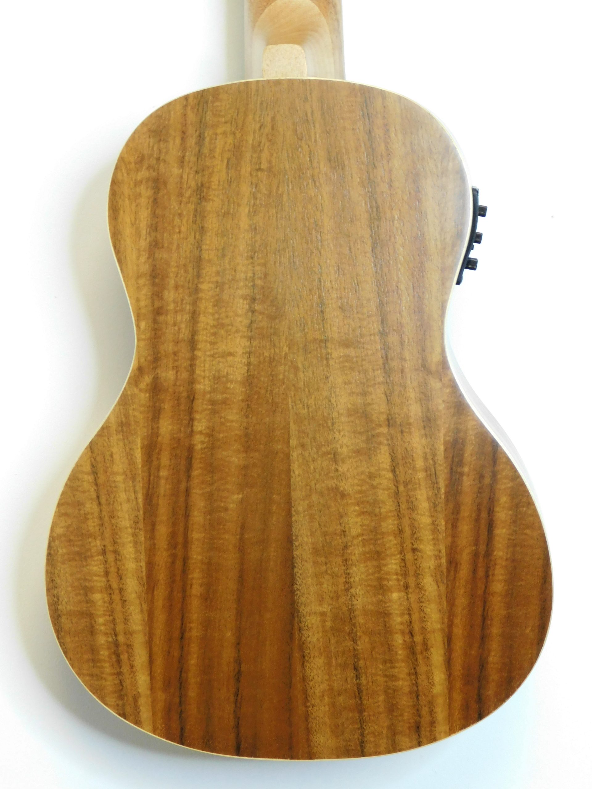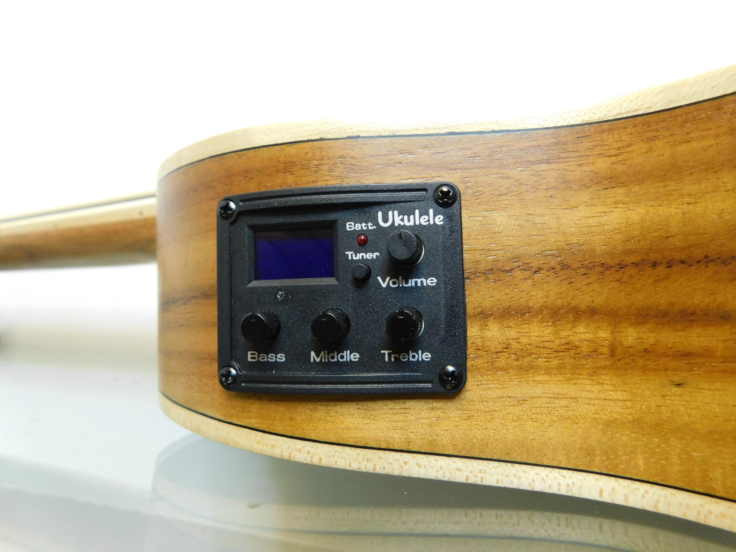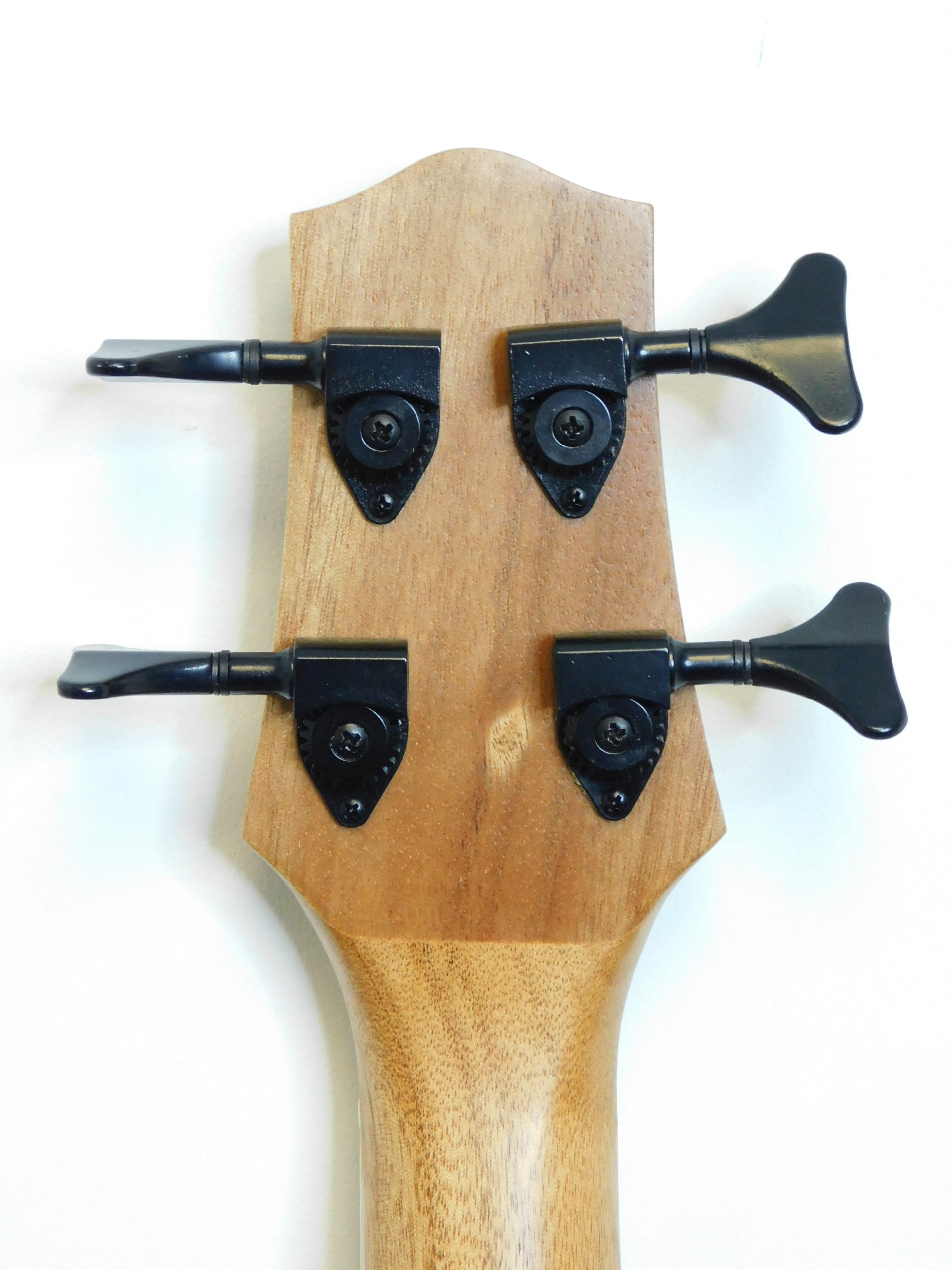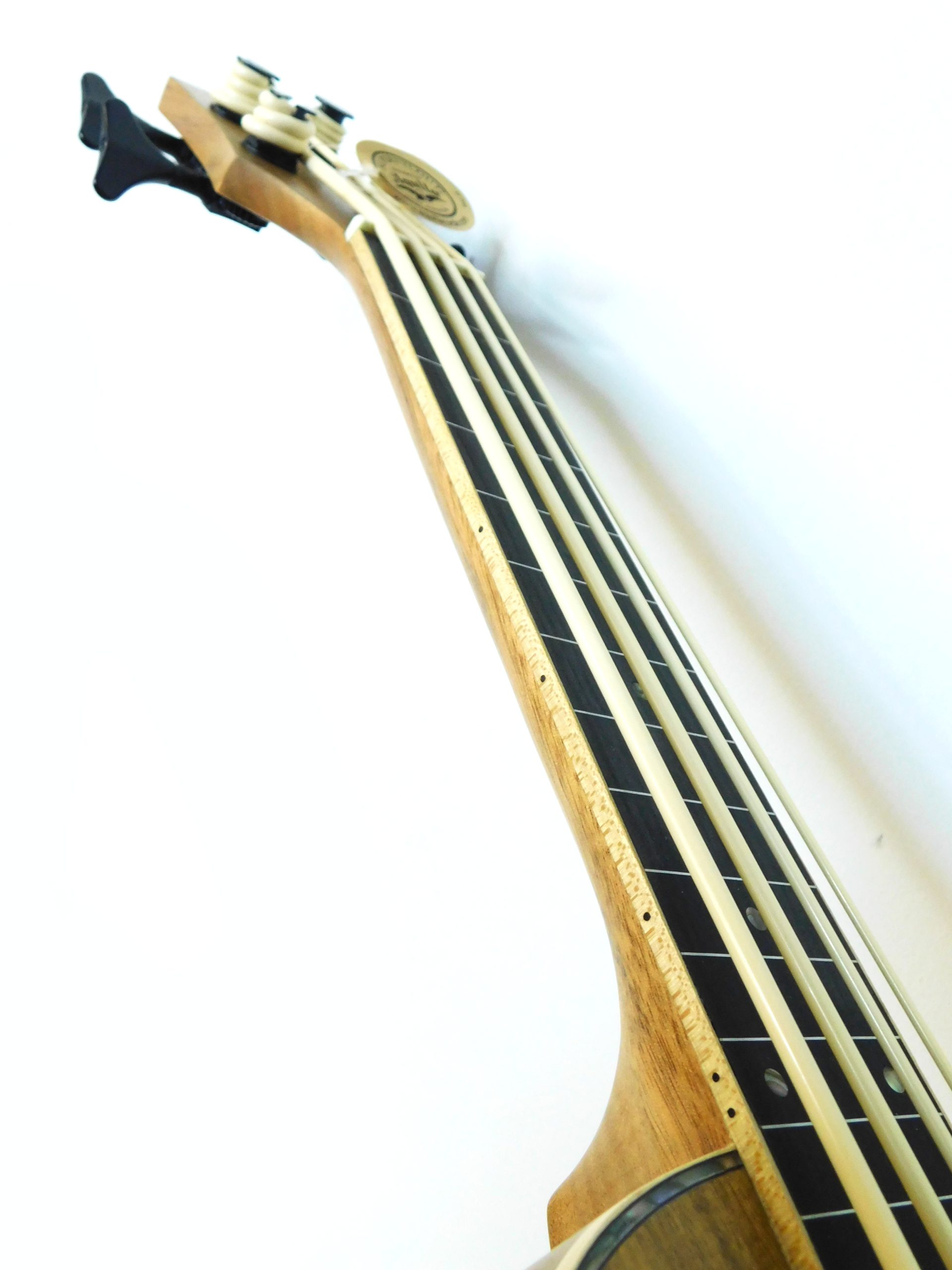 These beautiful koa ukulele basses from Aiersi offer classic double bass style tone either acoustically or amplified, in a small and very playable package! Their koa bodies have a gorgeous golden grain which is brought out nicely by the smooth satin finish and offset with attractive maple binding and faux abalone binding. The mahogany neck has a very comfortable slim D profile and the Aquila thundergut strings are very easy to hold down. The playing action is comfortably low and the clear, white markers make it very intuitive to find the correct points on the fretboard for accurate intonation. The hardware is quality too, with precise and reliable black geared tuners and a superb sounding under-saddle pickup and side mounted preamp. The preamp offers a wide range of tonal options with simple volume and three band EQ controls. There’s also a built-in tuner which is very precise and even works on the lowest notes this instrument can produce (the E equivalent to the bottom string of a standard bass guitar), meaning that you’ll never have to worry about tuning up in loud environments. All in all these fun and intuitive ukulele basses are a great way to fill out the sound at your local jam session or just enjoy smooth bass tone in the comfort of your living room!