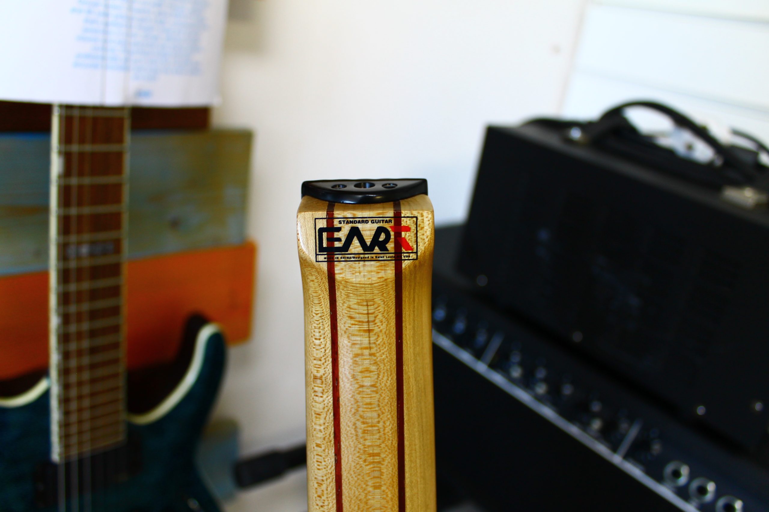 EART (short for “Electro-acoustic ART”) have over 20 years of production experience on behalf of other companies but have recently been making waves with their own unqie electric guitar designs. This awesome headless rock/metal guitar makes shredding a breeze and feels great for long gigs thanks to its light weight and comfortable, centralised centre of gravity. Despite its compact look, it has a full 25.5″ (648mm) scale length and pairs a roasted padauk body (plus beautiful poplar burl top) with a 5-piece roasted maple and padauk neck. This multi ply neck design has been chosenfor long term strength and stability. Its Indian rosewood fretboard has a 9.5″-14″ compound radius and 24 medium jumbo stainless steel frets. The neck profile tapers from U to C as you move up the fretbaord, which keeps your hand position consistent as you transition from rhythm into solos. The nut is bone for added sustain. The truss rod adjuster is sensibly mounted at the bottom of the fretboard. You may be wondering how you tune this guitar given its complete lack of headstock- don’t panic! There’s a clever tuning mechanism built into the bridge which gives precise and reliable adjustment with great tuning stability.
