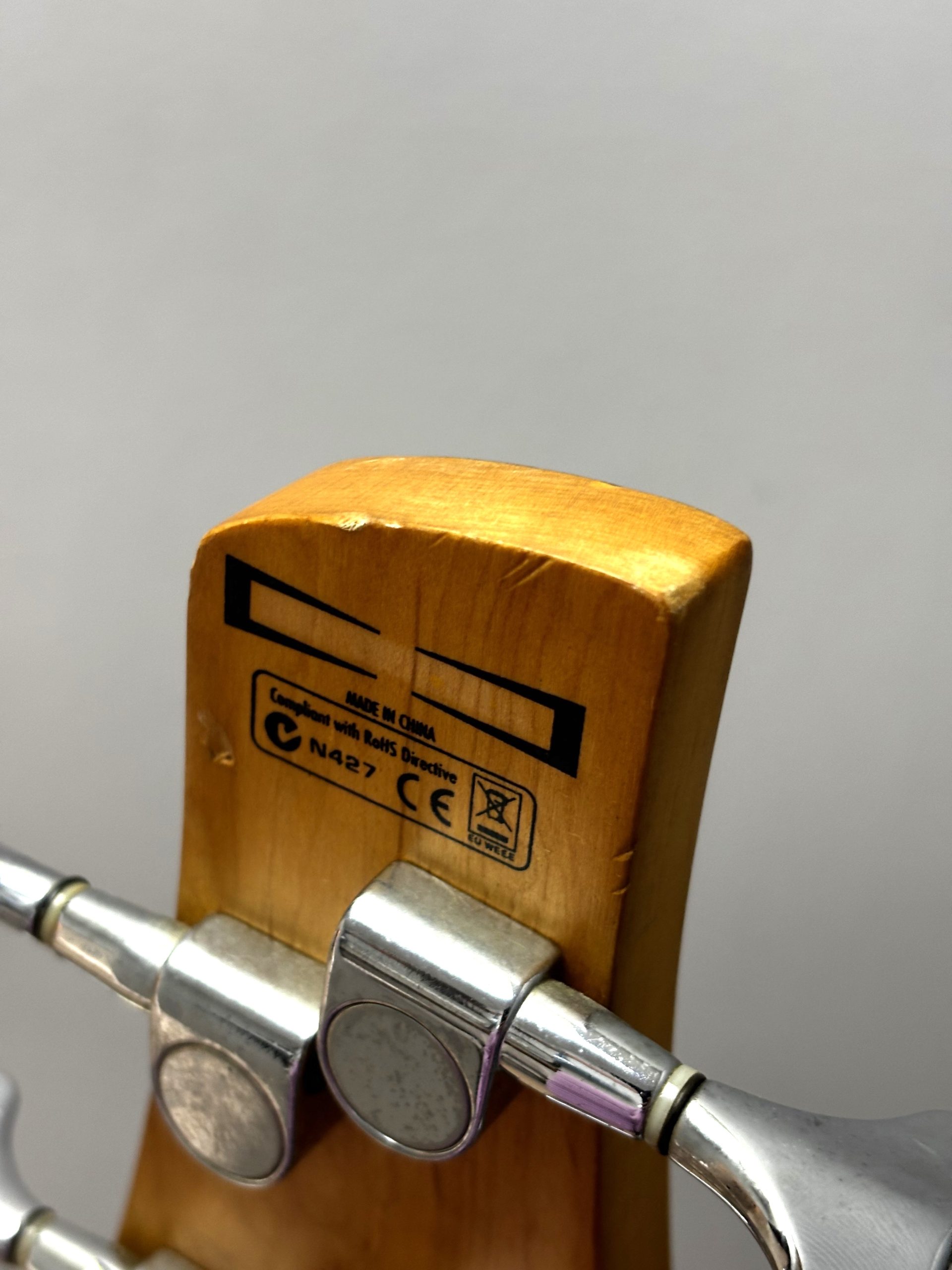 This bass is generally in good condition and has been professionally set up for a comfortable playing action, accurate intonation across the fretboard and well-balanced pickups. There are a few small chips and scratches, most notably a chip on the front between the pick-ups and the dings to the headstock which are shown in the photographs. There are white marks on the underside and on one of the horns as well as a few scuffs on the side of the body and a chip near the bottom strap pin. These are all fairly minor cosmetic features and do not affect tone or playability. Please call in for a test drive between 10-5 Tuesday to Saturday, or check out now to arrange affordable postage anywhere in the UK.