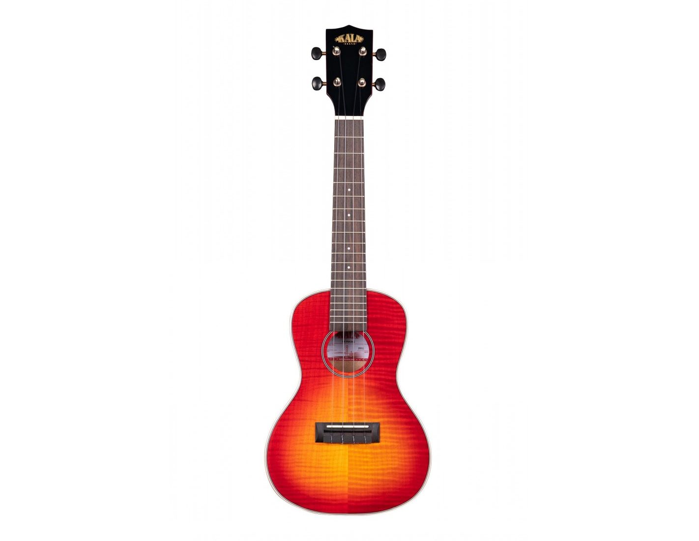 Kala’s KA-FMCB-C is a truly stunning ukulele, with a flame maple body and mahogany neck, in gorgeous translucent cherry burst finish. The body is offset with an attractive white binding and the neck has a rosewood fretboard and clear dot inlays so you won’t get lost while moving around the fretboard. The maple body gives a clear, bright tone which cuts through well in a group and sounds very sweet for fingerpicking or strumming! The hardware is quality, with a GraphTech Nubone nut and saddle and precise, reliable open geared tuners.