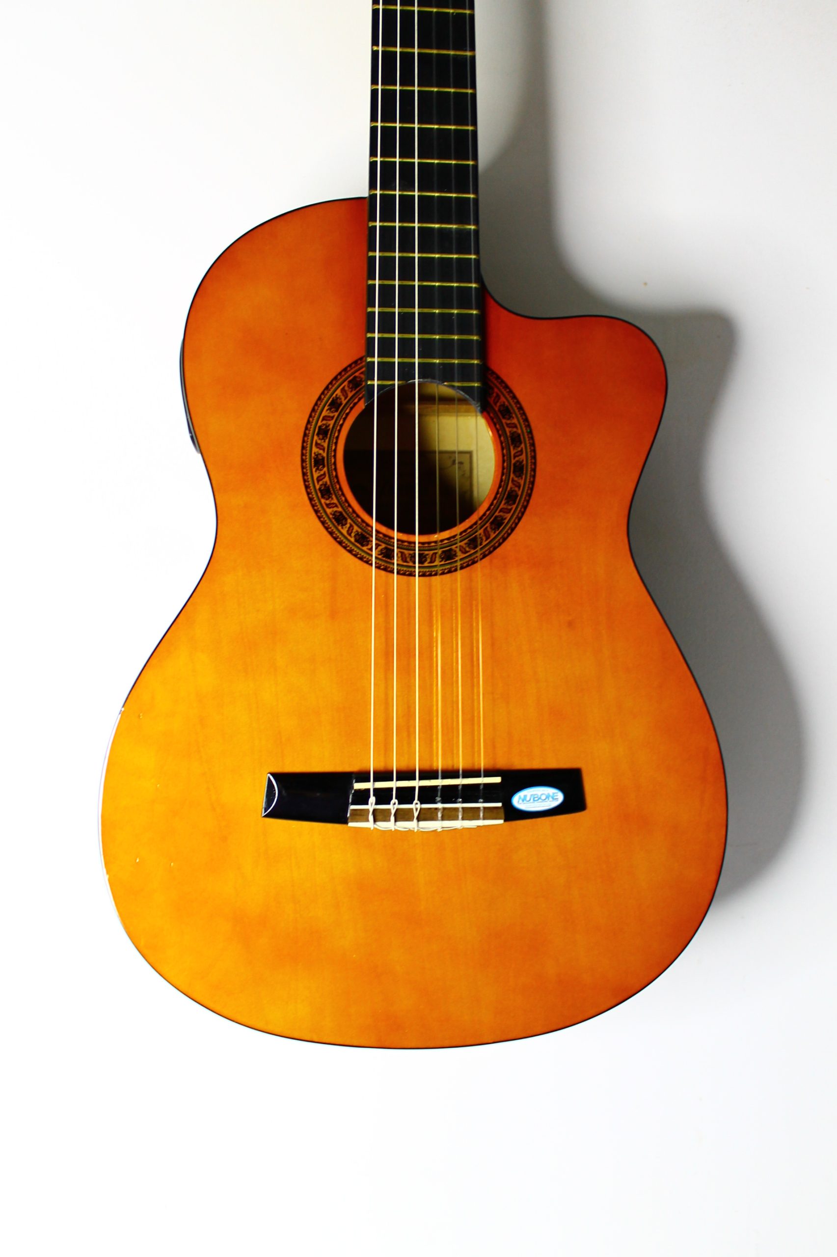 If you’re a beginner classical guitar player and looking to amplify your sound then you’ll love this great sounding and comfortable electro-classical guitar from the well established Valencai brand! It pairs a spruce top and mahogany back and sides for a full and sweet tone. The neck is fairly slim and the action is very comfortable. There’s also a built-in under saddle pickup and side mounted preamp with volume and tone controls, allowing you to accurately reproduce the instrument’s sound at greater volumes and control your sound live without having to tweak your amp or shout at the sound technician! This guitar is also fitted with a Graphtech Nubone nut and saddle for excellent sustain and good quality chrome geared tuners so you won’t have to worry about your tuning drifting during long performances.