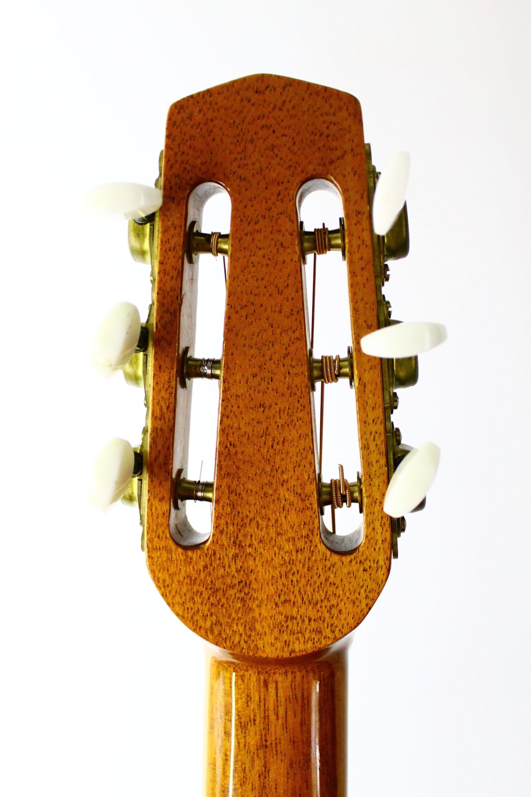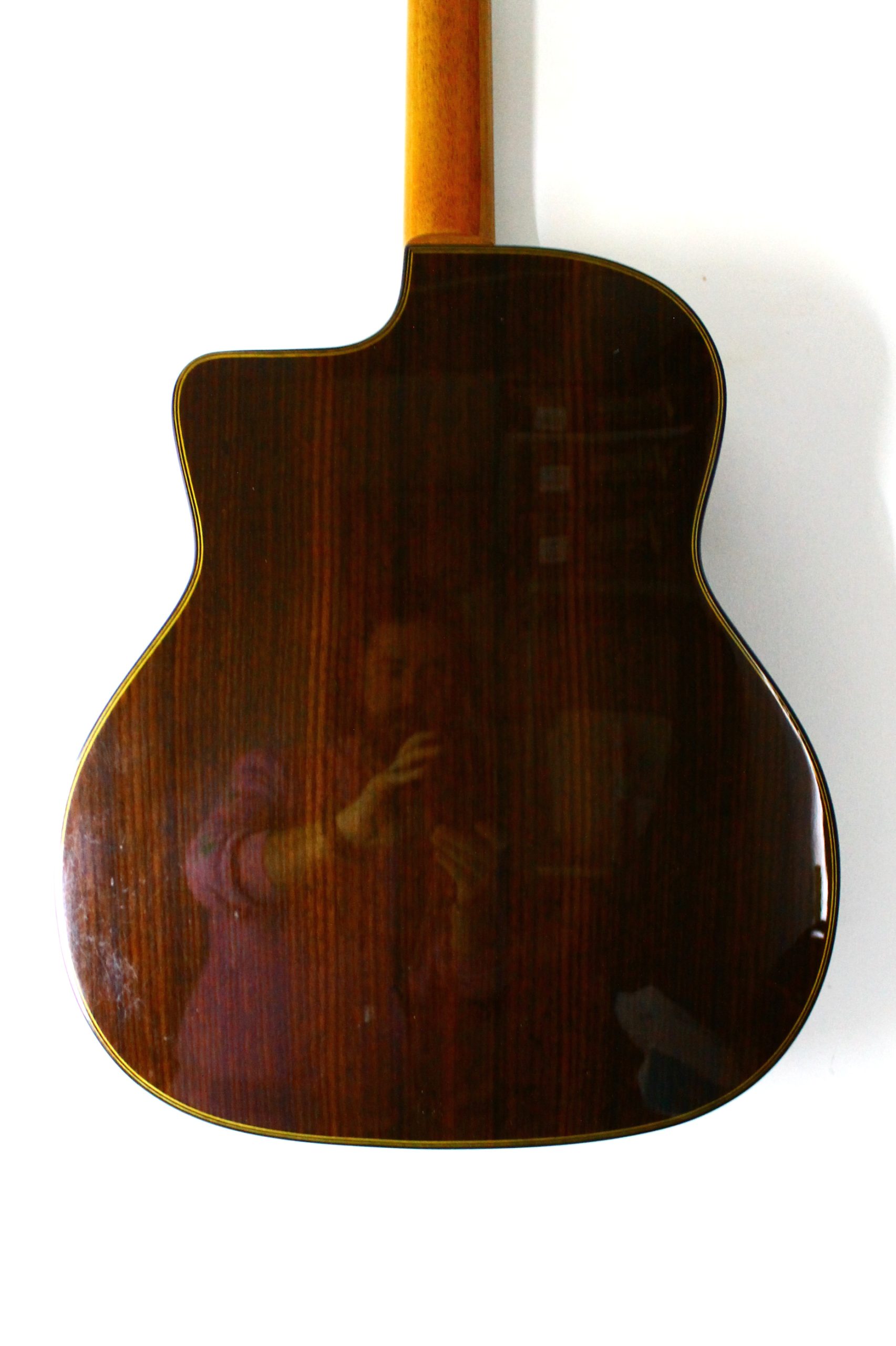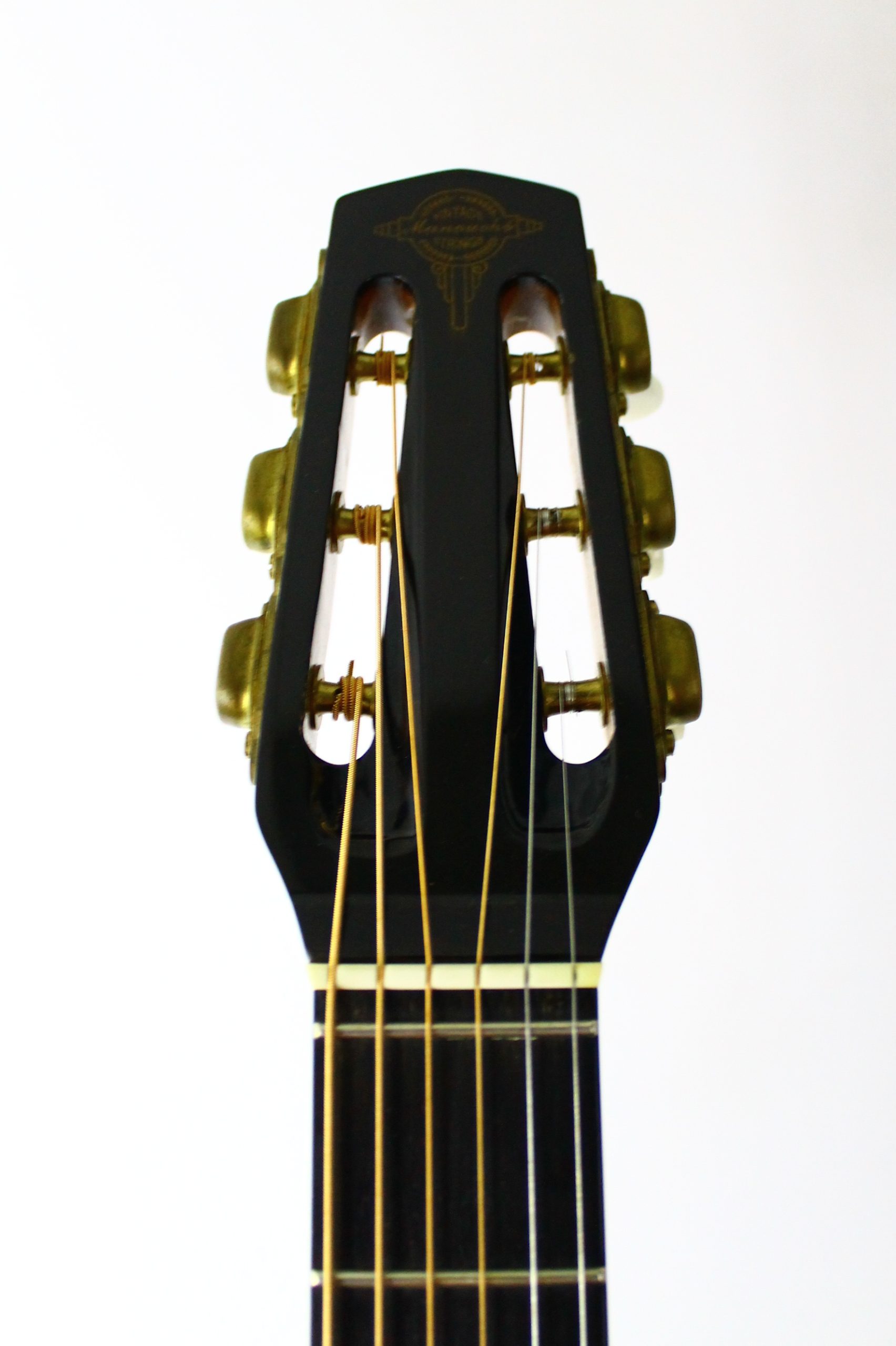 This gorgeous Selmer style jazz manouche guitar was made in Korea to a very high spec in 2009 and imported by Cheltenham based music shop, Vintage Strings. It features a rosewood back and sides and spruce top which give a tight and punchy tone with great volume, full, warm mids and a surprising amount of sustain. These are paired with a mahogany neck and ebony fretboard with beautiful mother of pearl dot inlays. The body is simply decorated with an attractive 3 stripe wooden binding and rosette inlay. At the headstock you’ll find a 45mm bone nut and gorgeous sealed gold tuners. This guitar’s original tailpiece has been professionally replaced due to a snapped pin- the replacement is brand new and looks great with stylish brass hardware, chrome string pegs and an attractive ebony block decoration. This guitar is also fitted with an under saddle pickup which sounds superb when amplified and has its jack output hidden in the bottom strap pin.
