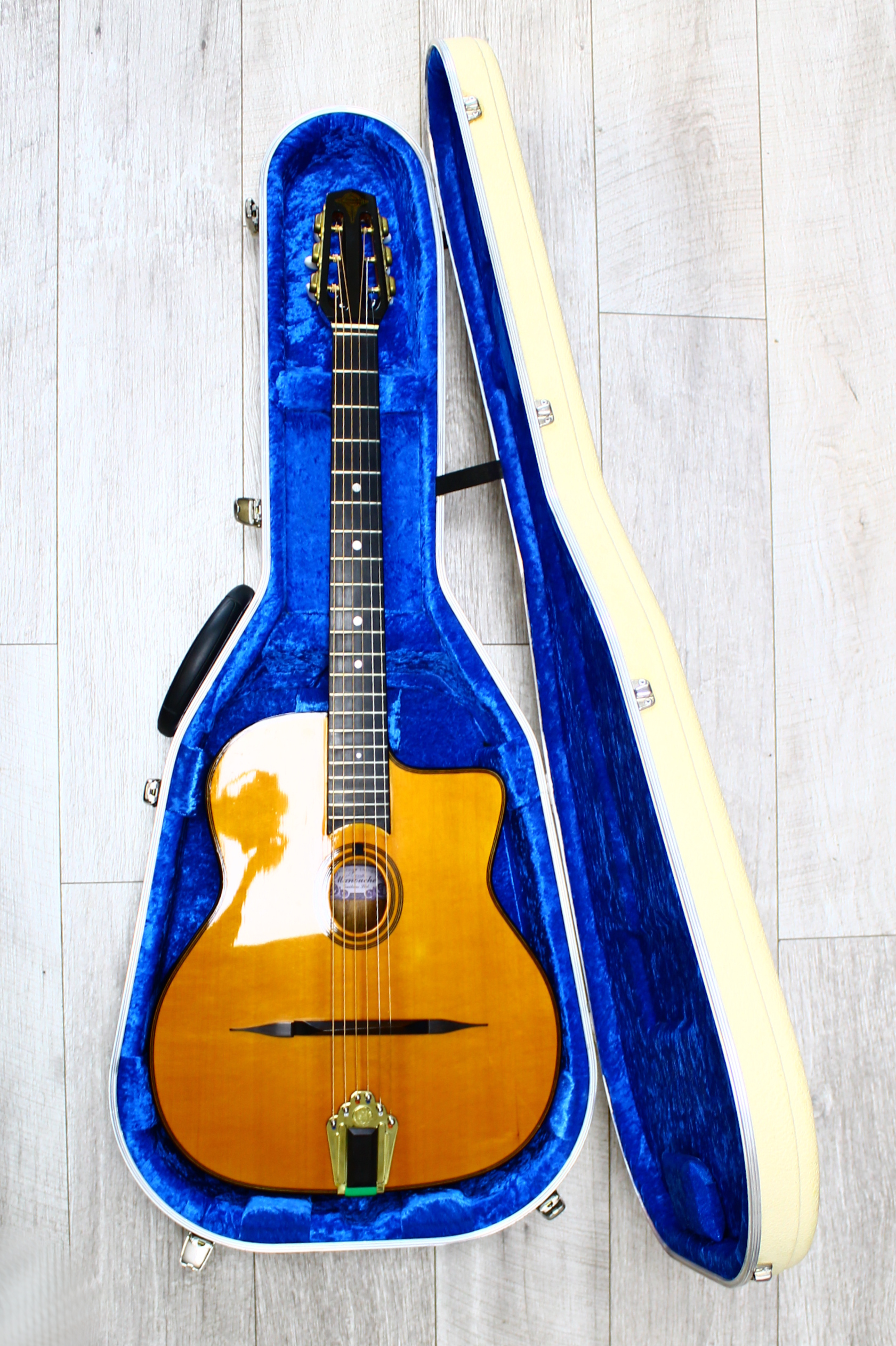 This guitar has been professionally set up and is all ready to play! It is in great condition aside from one or two very small dings and some very light scratches to the body and binding (see photos for closeups). The tailpiece has been upgraded to a good quality, high density brass version which is designed for enhanced sustain and easy restringing. There is virtually no fretwear. This stunning jazz manouche guitar also comes with its original fitted hard case.