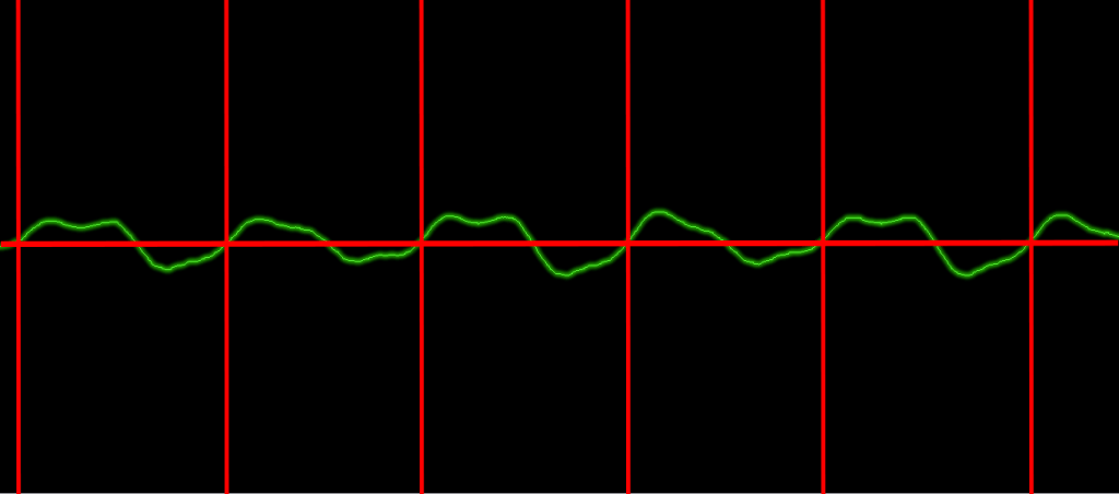 This is the waveform produced by a human (me!) singing with a smile. It makes an “Eeeee” type sound. You can see the frequency is roughly constant- every oscillation (1 peak and 1 trough) is marked with a vertical red line. This smaller wobbles are the partials of the wave- the extra frequencies added by the physical shape of my sound producing apparatus aka mouth and throat.